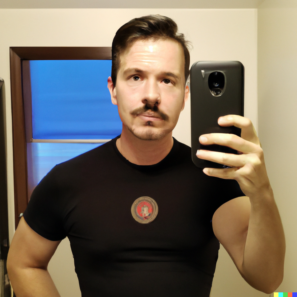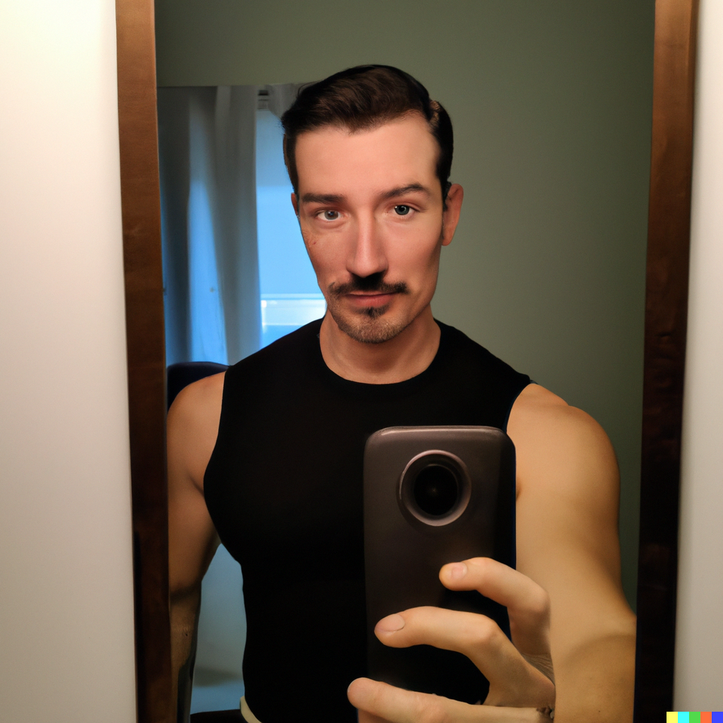 Mirror selfie, Male, Caucasian, Unkept short Brown hair, Brown eyes, Moustache, Athletic, Black shirt