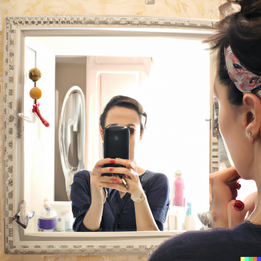 Mirror selfie, Male, Caucasian, Unkept short Brown hair, Brown eyes, Moustache, Athletic, Black shirt, iPhone x, 25 years old, Smirk